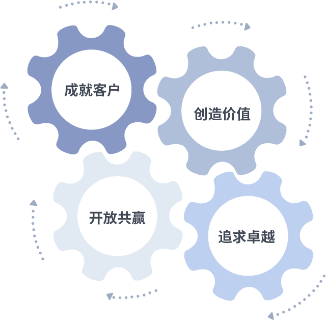 成就客户是一切决策的出发点,,,,创造价值是衡量所有工作的标准,,,追求卓越是y80000永利棋牌做事做人的态度,,,,开放共赢是y80000永利棋牌的格局也是最终的结果。。。。价值观的齿轮环环相扣,,推动着组织里的每个人不断向前。。